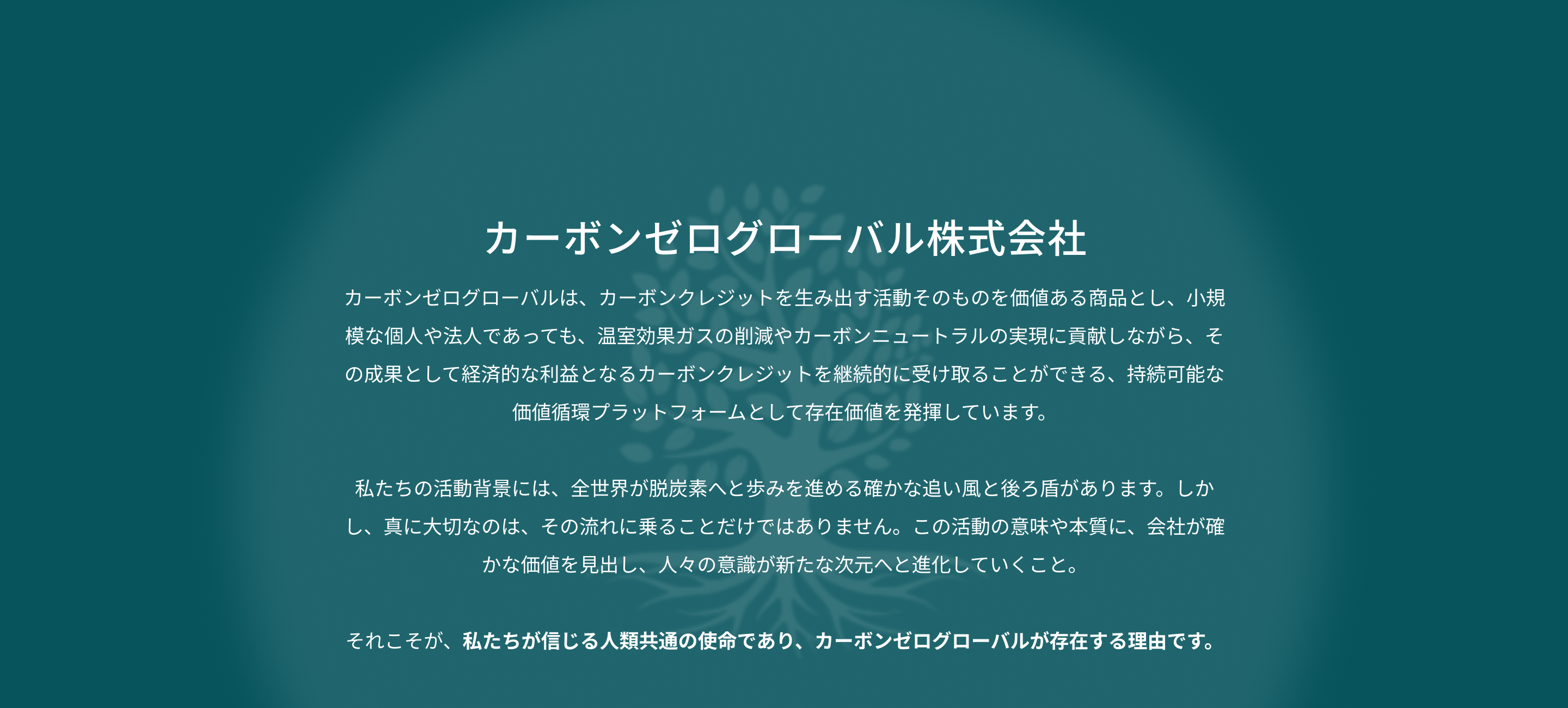 カーボンゼログローバル株式会社は、単にカーボンクレジットを扱う会社ではありません。私たちは地球環境の未来を守る責任を果たしつつ、社会活動との調和を実現するために、この市場に取り組んでいます。