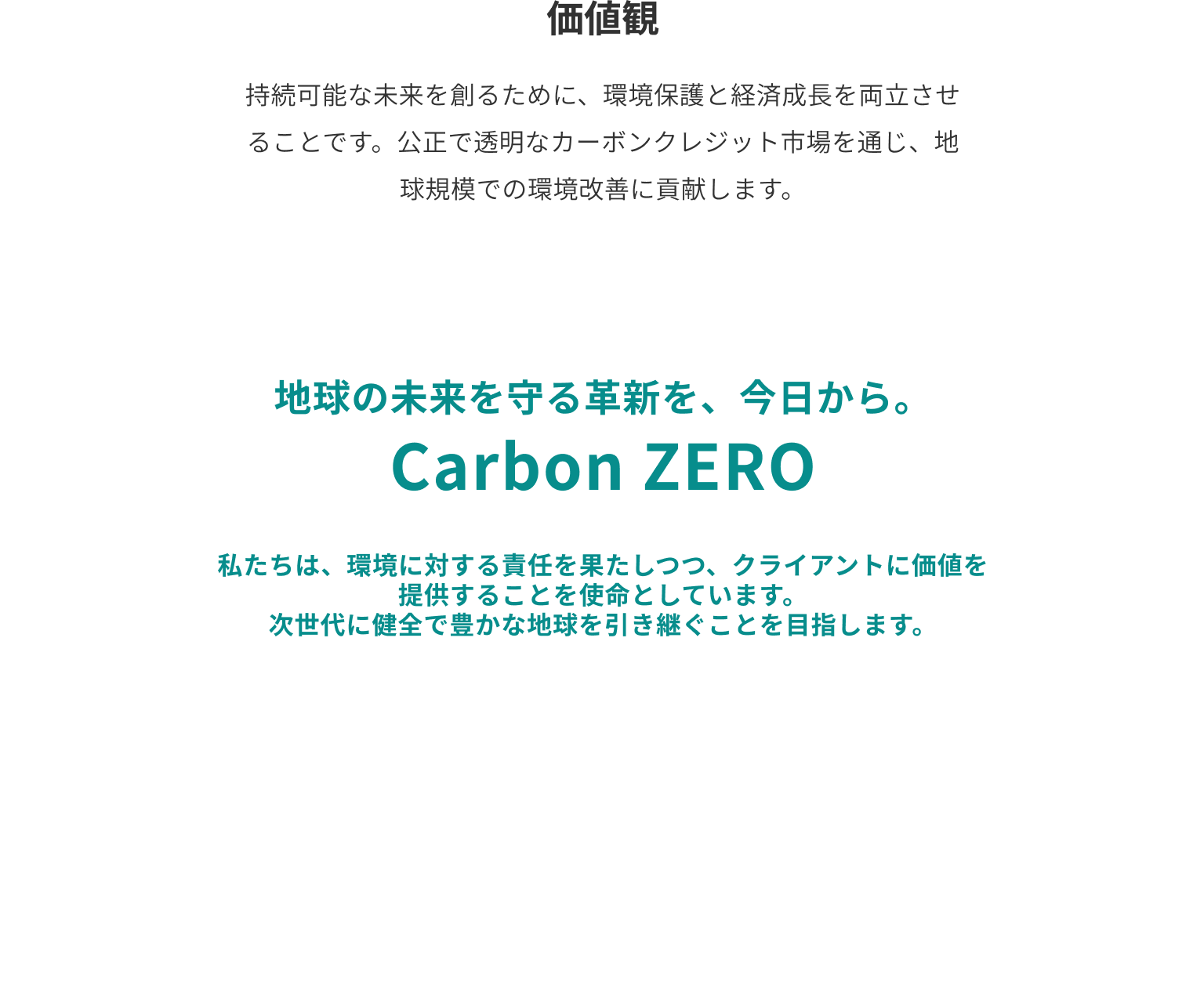 私たちは、カーボンクレジットを活用することで、温室効果ガスの削減を促進し、地球温暖化を抑制する世界を目指します。企業や個人が環境保護に取り組むことで、その努力が適切に評価され、地球全体で持続可能な発展を実現できる仕組みを作り上げたいと考えています。