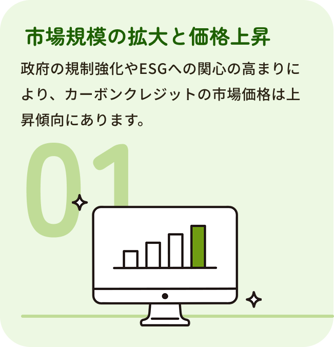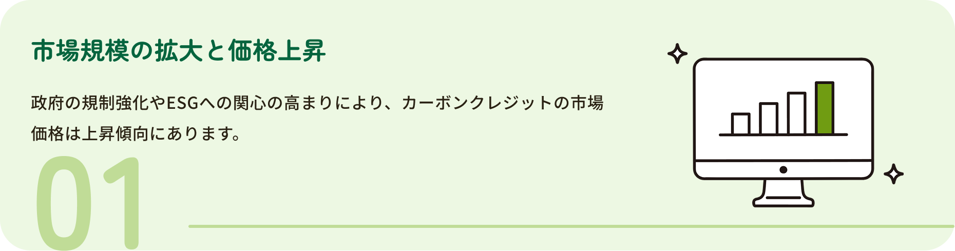 カーボンクレジットは、国際的な環境対策の流れを受けて、その重要性がますます高まっています。企業による脱炭素への取り組みが進むなか、今後も市場の拡大が期待されています。そうした背景から、将来的な価値向上への関心も広がりを見せており、新たな選択肢として注目されています。
