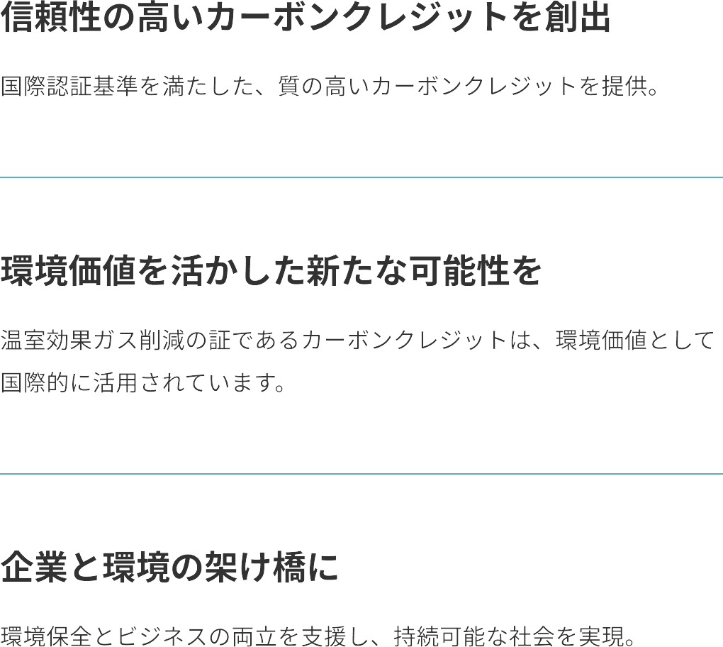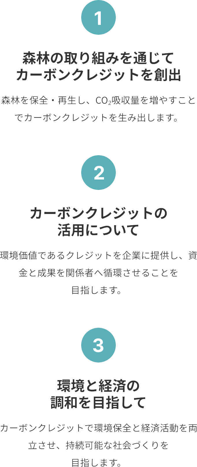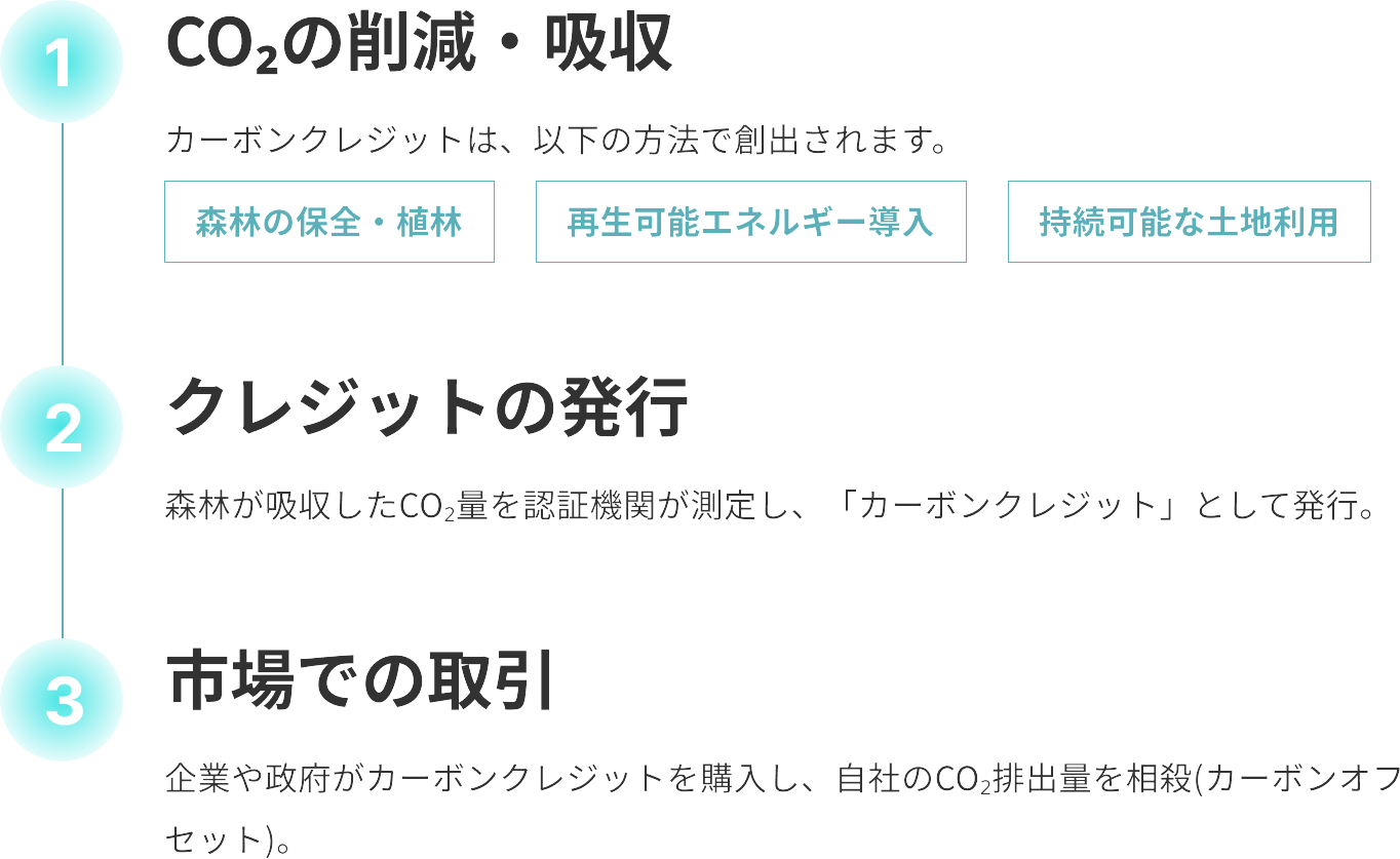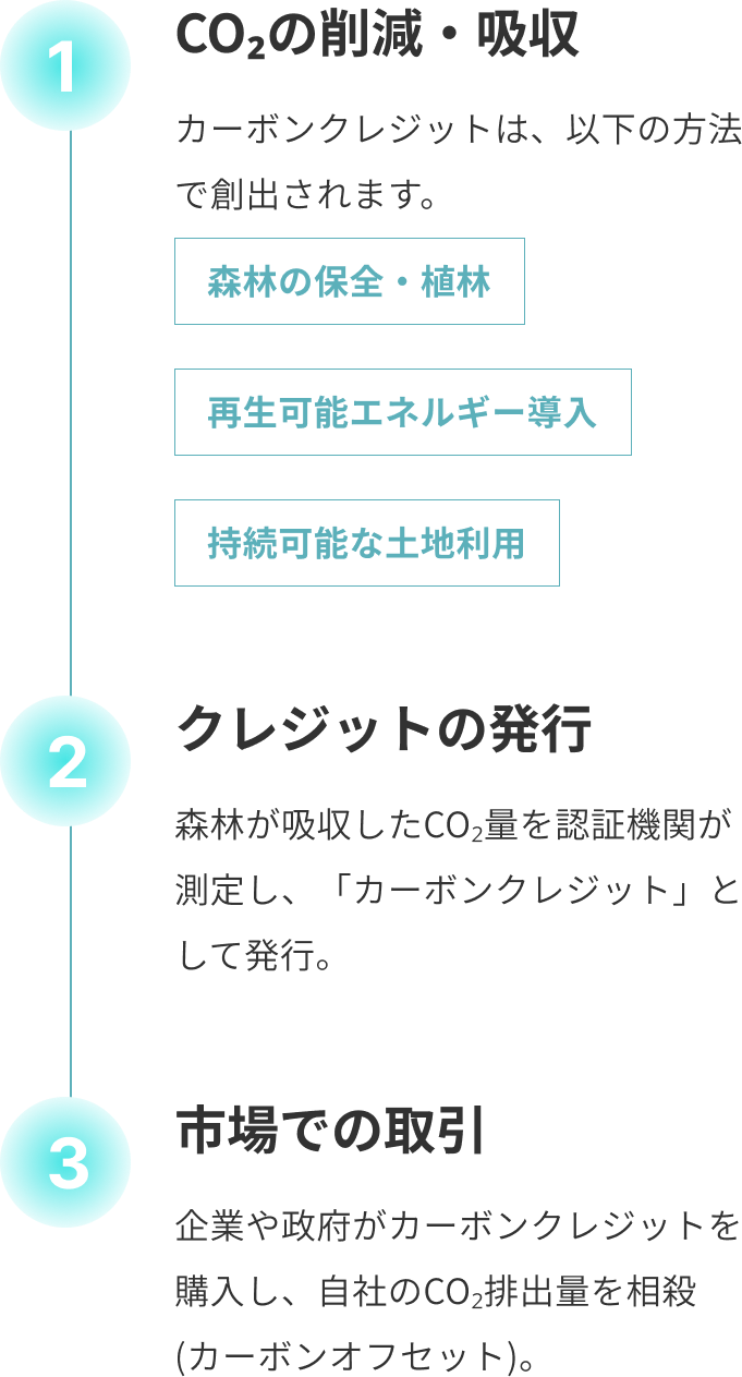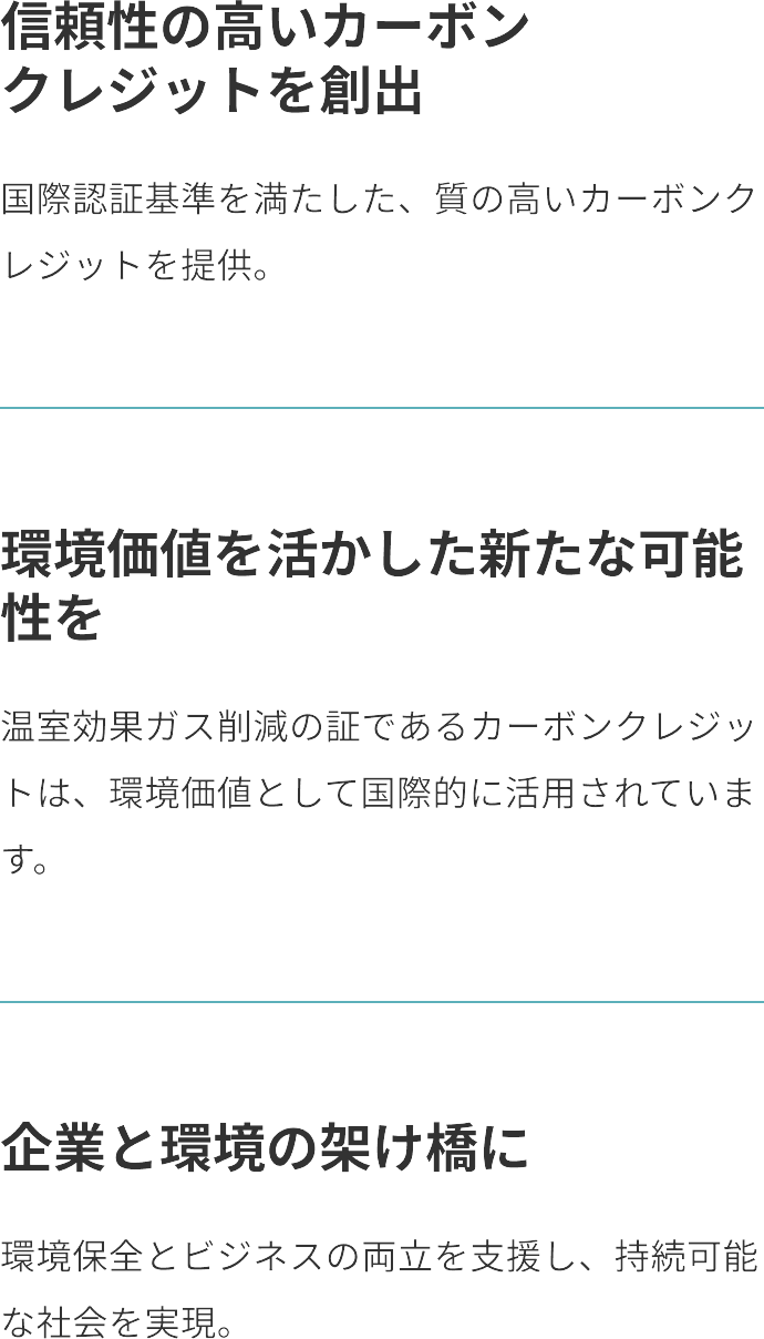 カーボンクレジットは、温室効果ガスの排出削減や吸収によって発行される仕組みです。当社では、森林資源を活用したプロジェクトを通じてカーボンクレジットの創出に取り組み、環境への貢献と持続可能な社会の実現を目指しています。