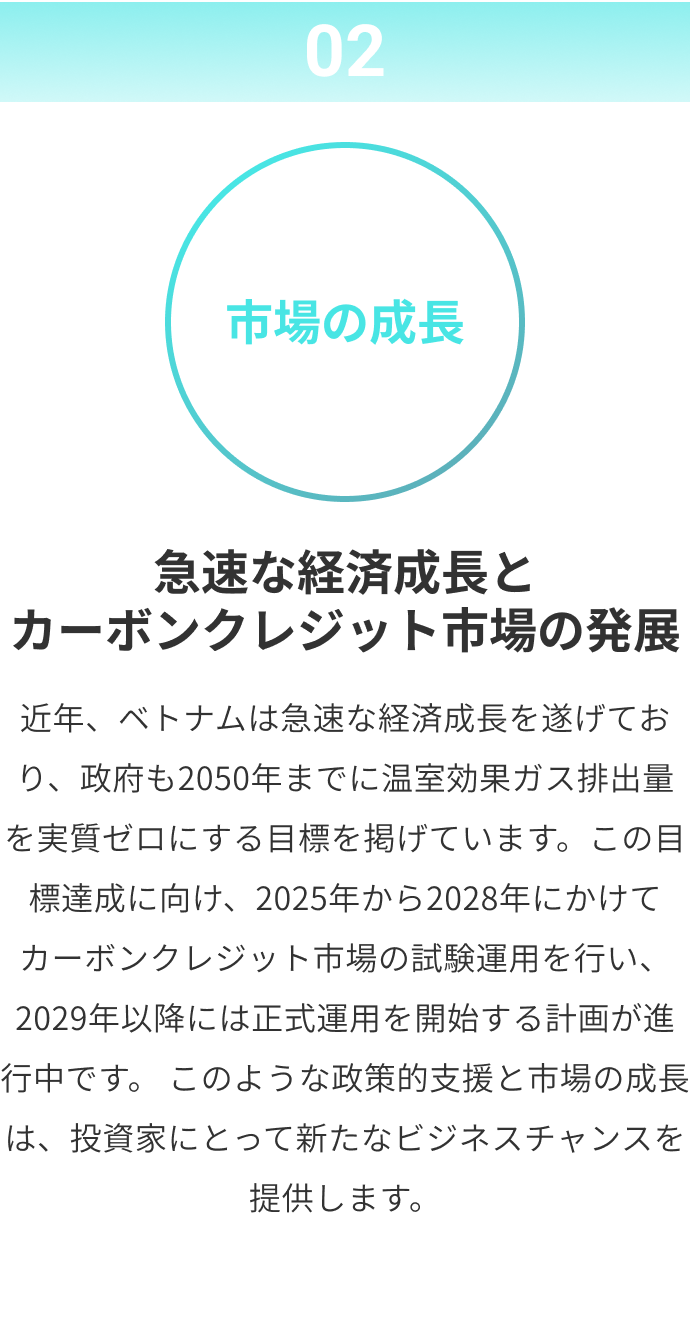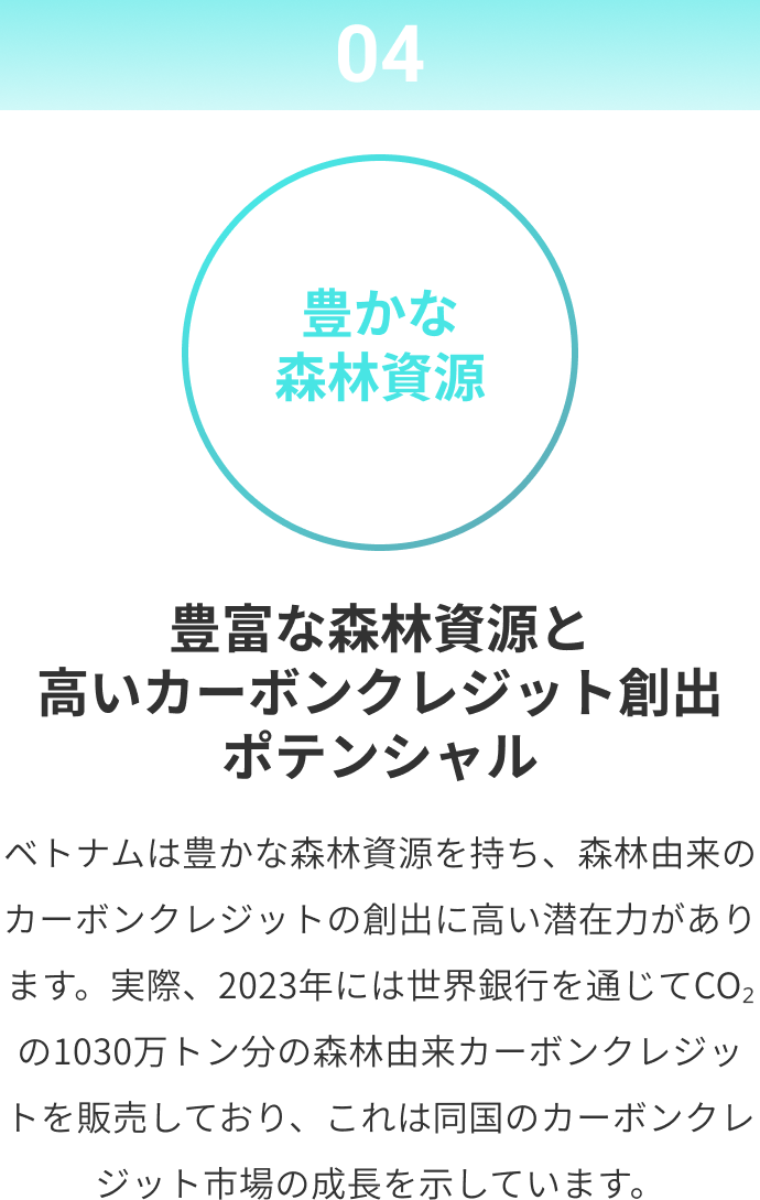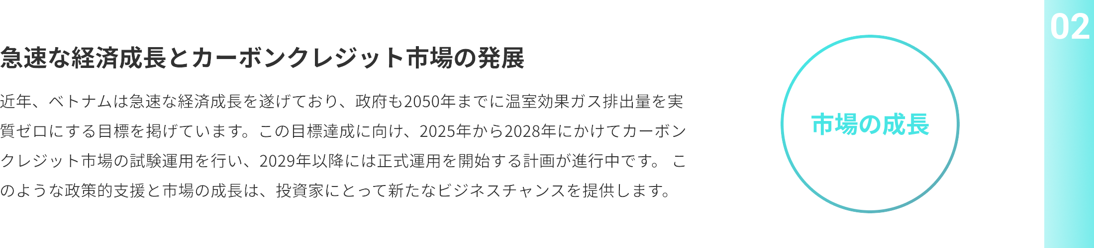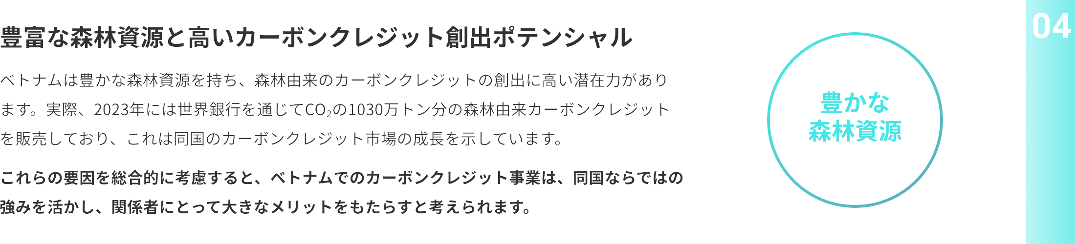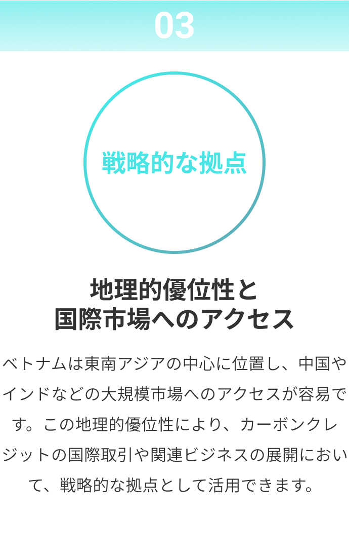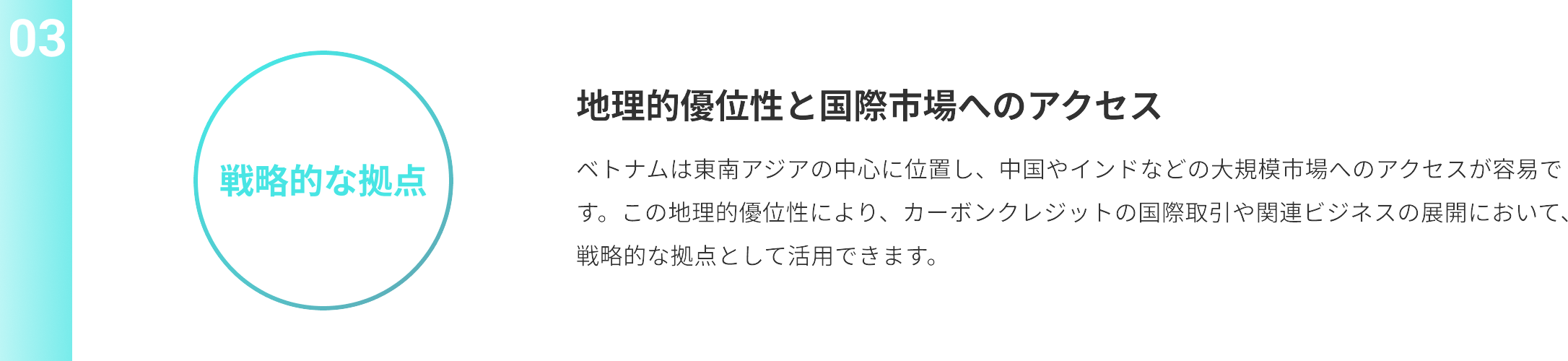 ベトナムにおけるカーボンクレジットは、同国特有の優位性とメリットを活かすことで、企業や組織にとって大きな可能性をもたらします。以下に、ベトナムの強みと取り組みによる利点をまとめます。